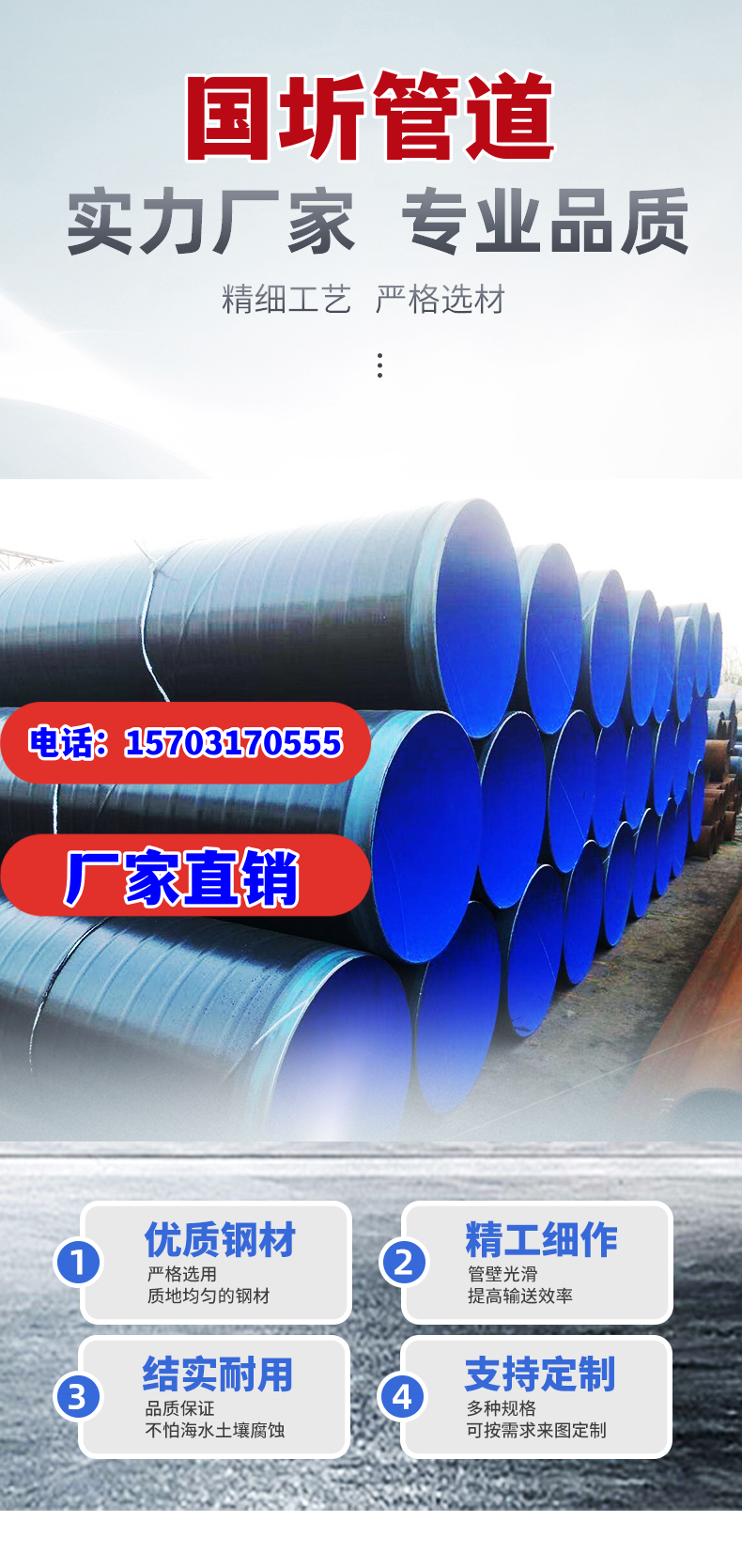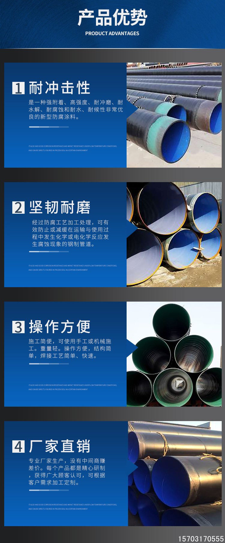 外壁采用熱熔結(jié)纏繞工藝底層環(huán)氧樹脂、中間層膠黏劑、外層聚乙烯形成三層結(jié)構的防腐層,內(nèi)壁采用熱噴涂環(huán)氧粉末防腐方式,將粉末經(jīng)高溫加熱熔結(jié)后均勻地涂敷在管體表面上,形成鋼塑復合層,極大提高了涂層附著力及涂層厚度,增強了耐磕碰,耐腐蝕的能力。